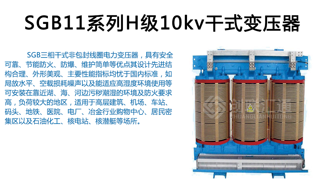 SG(B)11系列H級絕緣干式變壓器采用優(yōu)質(zhì)環(huán)保材料,先進(jìn)的生產(chǎn)檢測設(shè)備按嚴(yán)格的工藝生產(chǎn)而成,具有高性能、高安全、承受熱沖擊能力強(qiáng)等特點(diǎn),它適用于防火要求高、負(fù)荷波動(dòng)大以及污穢潮濕的惡劣環(huán)境中。如:高層建筑、商業(yè)中心、住宅小區(qū)、醫(yī)院、化工廠、核電站、船舶及其它安全性要求防火、防爆、防潮的配電網(wǎng)絡(luò)與工礦企業(yè)供配電系統(tǒng)等重要或特殊環(huán)境場所。