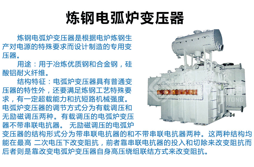電弧爐變壓器具有普通變壓器的特性外,還要滿足煉鋼工藝特殊要求,有一定超載能力和抗短路機(jī)械強(qiáng)度。電弧爐變壓器的調(diào)節(jié)方式分為有載調(diào)壓和無勵磁調(diào)壓兩種。有載調(diào)壓的電弧爐變壓器不帶串聯(lián)電抗器。 無勵磁調(diào)壓的電弧爐變壓器的結(jié)構(gòu)形式分為帶串聯(lián)電抗器的和不帶串聯(lián)電抗器兩種。這兩種結(jié)構(gòu)均能在高 二次電壓下改變阻抗,前者靠串聯(lián)電抗器的投入和切除來改變阻抗,而后者則是靠改變電弧爐變壓器自身高 壓繞組聯(lián)結(jié)方式來改變阻抗。