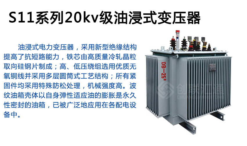 S11系列20kv級油浸式變壓器為配電網(wǎng)絡與工礦企業(yè)供配電系統(tǒng)中的重要設備,在工礦企業(yè)、農(nóng)業(yè)和民用建筑中廣泛使用,也可用于石油、化工行業(yè)中多油污、多化學物質(zhì)的場所。使用環(huán)境:戶外/戶內(nèi)使用,海拔不超過1000m。